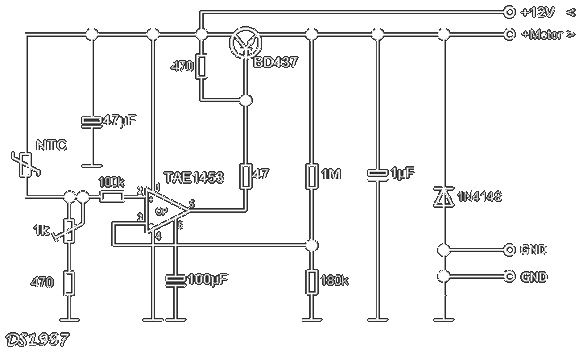 Majdnem minden processzorventillátor, még a legújabb, fordulatszám-mérővel ellátott példányok is mindig ugyanazzal a sebességgel működnek, függetlenül attól, hogy mennyire meleg a CPU. Ennek elviekben természetesen semmi értelme, hiszen a gép hol teljesen le van terhelve, hol kevésbé és van, amikor semennyire; logikusnak tűnne, ha a hőmérséklethez igazodva a ventillátor ennek megfelelően hol alacsonyabb, hol magasabb fordulatszámon működne. A megoldás? Sajátkezűleg készíteni egy fordulatszám-szabályozót. Ehhez nincs másra szükség, csak néhány olcsó alkatrészre és némi alapvető jártasságra az elektronikában. Íme az elkészítendő szerkezet: